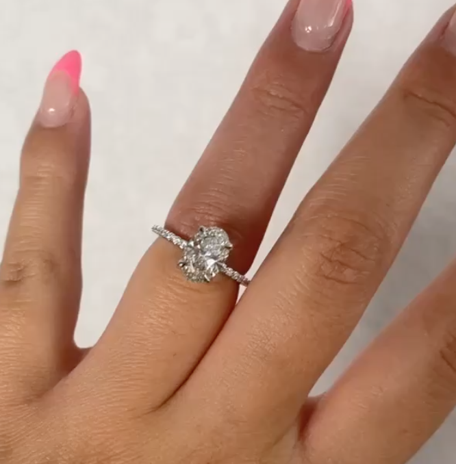 Diamond accented mounting with a classic 1.5 carat oval lab-grown diamond. Diamond specs varies between VS1-SI1 clarity; G-J color. Please contact us for platinum pricing.